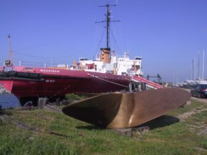 Like we say about antennas, when it comes to props, you can’t have one that’s too big–that is unless your boat can’t stay afloat with it. In this case, the 5,252 ton Mackinaw had no problem both supporting and turning these 14 foot propellers at the stern and a smaller 12 foot propeller at the bow. Somewhat more subtle in this picture is the 160 through 40 Meter Alpha Delta dipole above the ship’s Port side. If you look just above the “I” in Mackinaw, you can see the 10 foot support holding the aft end of the dipole. If you’re not Broadband challenged (like many of us in Northern Michigan), you can click on the High Res link and should be able to follow the support rope part of the way up to the antenna, which isn’t too visible in this picture.