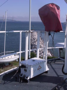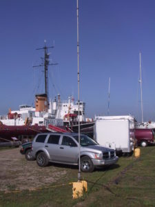 One of the antennas used for Field Day was this HF vertical. Sitting at its base is a Sunair automatic antenna coupler used to match the antenna to whatever frequency on which the attached RT-9000 radio may be set. This is one of the antennas that was on the ship at the time of the ship’s retirement. The Coast Guard cut both the transmission line and control cable to this coupler, as well as the lines to the matching antenna and coupler on the port side. This would be the Starboard antenna and coupler. You can tell because the ship is docked heading West toward the center of Mackinaw City, the Mackinac Bridge is North of Mackinaw City, and the bridge is visible in this picture (make sense?). The break wall in the picture is the one protecting the East side of the current public marina. You may now ask why we were using a permanently installed antenna for Field Day. The reason is that we were running class “F” as an EOC. The ship, which has been used in emergency exercises, is classified as an established EOC (well, arguably since it was sort of, kind of, designated that during the exercise). Not to worry, we hardly represent competition to any other Field Day stations since we spent so much time working on things, eating, sleeping, and of course taking pictures–not to mention the continuing noise problems from things on the ship (which is still something to work on).