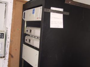 Don’t ask me why a picture of the two Ham repeaters on board the Mackinaw are included on a page about Field Day. I suppose a good excuse is that we moved the UHF antenna to the higher location that weekend and we wanted to show you where the other end of the cable goes. Unfortunately, you can’t see that, because the UHF duplexer, which is sitting on top of the repeaters, is hidden inside the rack. In fact, we couldn’t see it either because the rack is too close to the wall and the VHF duplexer (also not visible) is sitting on the floor next to the rack making it even more difficult to get back there. We assume the cable ended up in the right connection because the repeater seems to work. Perhaps someday we’ll know for sure. In any case, we don’t have another picture of the repeaters in our Web site–so here they are. The repeaters, Motorola Desktrac’s, were cheap on E-Bay but have to be the worst repeaters I’ve every worked with (almost). These things are marginally stable in frequency but do manage to stay close enough to be usable and the COR output was a real pain to work with. The blank panel below the repeaters is the RLC-2 controller and the unit above is one of the many UPS’s left on this ship. This one is providing some amount of backup power in case the mains power to the ship gets interrupted. By the way, this is in the “Crypto” room and is where the ship’s HF radios were located. The rack with the repeaters was the rack that held all of the data and crypto equipment. Needless to say, that equipment was not left by the Coast Guard.